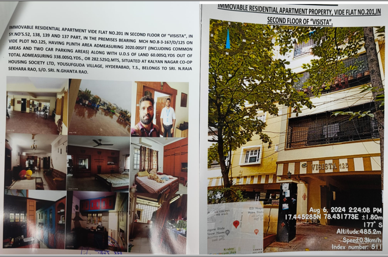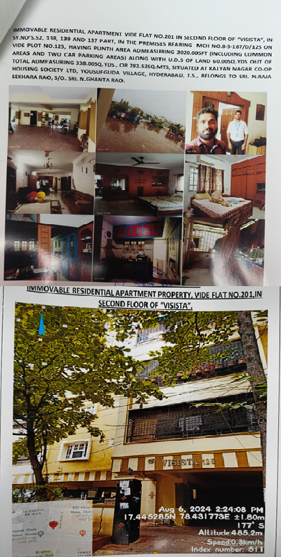 Property Details: All that the Semi finished Flat No.201 in the 2nd floor of Visista Apartments, having plinth area admeasuring 2020 Sq.ft (inclusive of common areas and 2 car parking areas) together with proportionate undivided share of land 60 Sq.yds out of 338 Sq.yds in the premises bearing M.C.H.No.8-3-167/D/125, on plot no.125, sy.no.52,138,139 & 137 part admeasuring 338 Sq.yds or 282.56 Sq.mts situated within the lay out of the Kalyan Nagar Co-operative Housing Society Ltd, Yousufguda, Hyderabad covered vide Sale Deed No. 1748/2007 of SRO Banjara Hills and MODTD No.2227/2016.