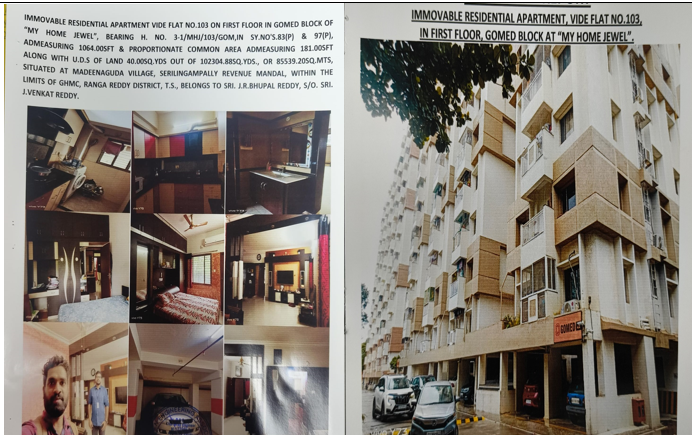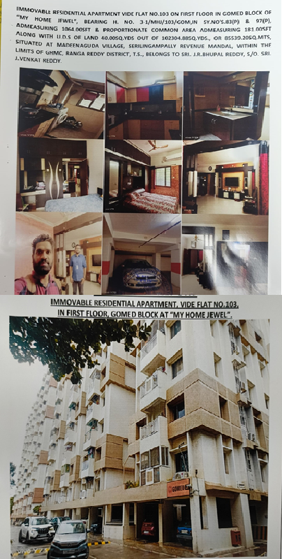 Property Details: All that the Semi-Finished Residential Flat admeasuring 1064 Sq.ft of built-up area and proportionate common area admeasuring 181 Sq.ft bearing Flat No.103 on 1st floor in Gomed Block along with 1 car parking lot No.51 in Cellar in Gomed Block together with the undivided share of land equivalent to 40 Sq.yds., out of the Schedule “A” property, in the Multi-storied Residential Apartment Complex known as “MY HOME JEWEL” in Sy.No. 83(P) and Sy.No. 97(P) situated at Madeenaguda village, Serilingampally Revenue Mandal, within the limits of Greater Hyderabad Municipal Corporation, RR district, Telangana covered vide Sale Deed No. 7015/2010 of SRO RangaReddy and MODTD No.2038/2016 SRO Balanagar.