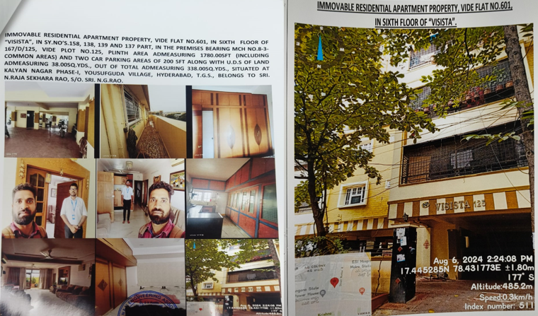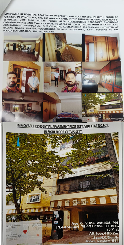 Property Details: All that the Flat No. 601 on 6th floor of Visista Apartments, admeasuring 1780 Sq.ft (including common areas) 2 car parking area of 200 Sft and one servant room in stilt floor by the side of staircase having plinth area of 185 sft together with proportionate undivided share of land admeasuring 38 Sq.yds out of 338 Sq.yds (total premises an extent of land 690 Sq.yds) in the premises bearing M.C.H. No. 8-3-167/D/125, on plot no.125, sy.no.158, 138,139 & 137 part situated within the layout of the Kalyan Nagar Co-operative Housing Society Ltd, Yousufguda, Hyderabad covered vide Sale Deed No. 1555/2008 of SRO Banjara Hills and MODTD No.2227/2016.