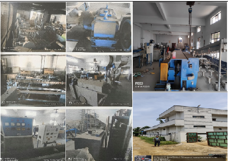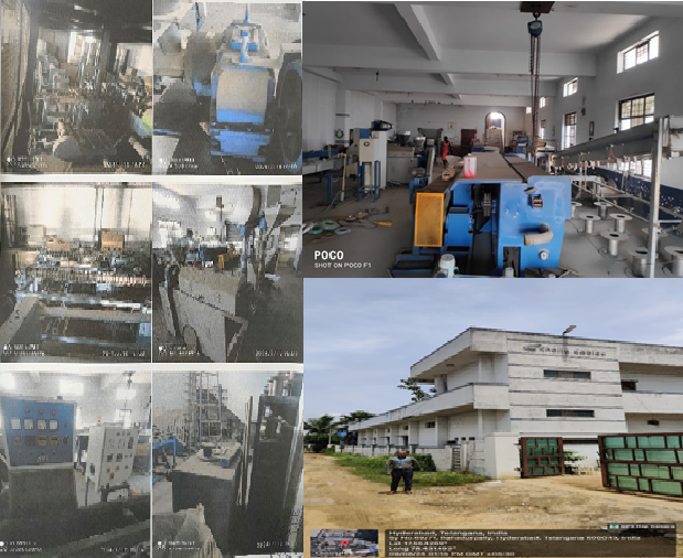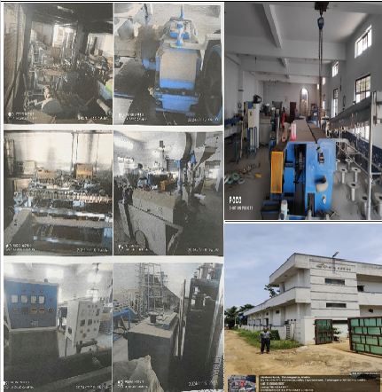 16. a) RBD wire drawing Machine with 30 HP AC motor with inLet 8 mm and output 2 mm capacity 700 kgs. Per 8 hrs - 1 No. b)Intermidinte wire drawing machine with 15 HP AC motor with inlet 2 mm and output 1.2 mm capacity 450 khs per 8 hrs - 2 No. 3) Taping machine vertical with 6 heads and Fine wire machine with 10 HP AC motor with inlet 1.2 mm and putput up to 0.150 mm capacity 625 kgs. per 8 hrs. - 2 No. 4) Annealing machine with 24 bobbing capacity 7 Kgs each per hour. 5) Motorized Pointing and threading machine - 3 No. 6) Bobbins with 500 kg capacity. 7) PC dies set & nozzles - 200 Nos. 8) Hydraulic Trotley - 3 No, 9) Coil