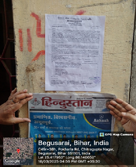 All that part and parcel of the Land measuring 14 Dhur 05 Dhurkib Situated at Chitragupta Nagar, Mauza- Pokharia , Khata No- 72, Khesra No-45, Thana No-346, Touzi No-10287, Holding No-65 of Ward No 35,Thana& Anchal & District- Begusarai