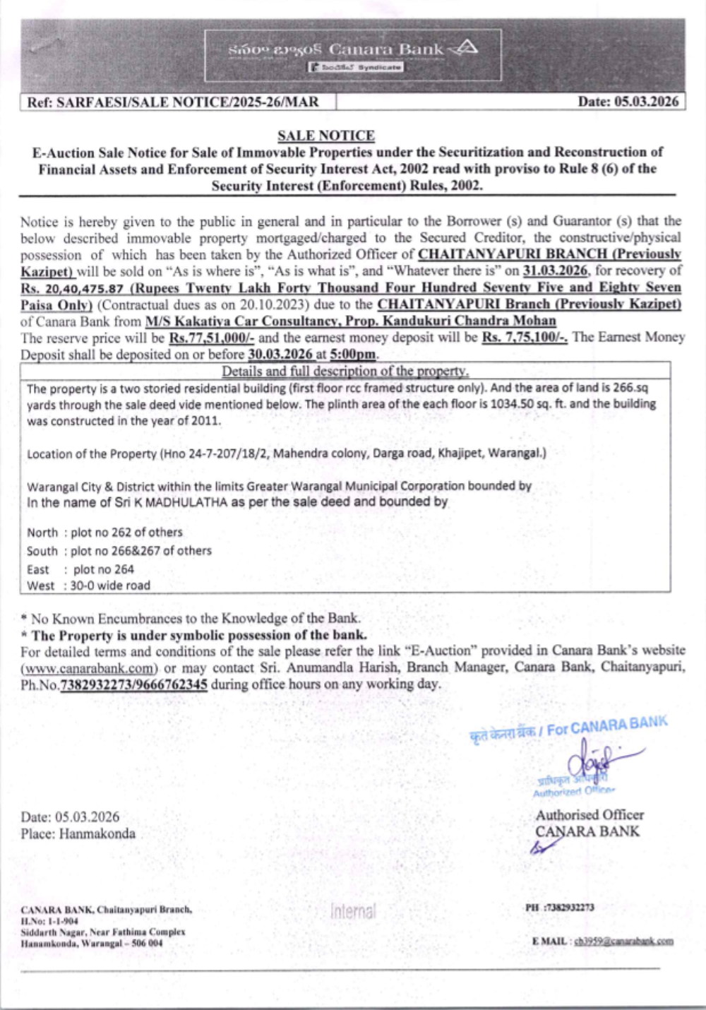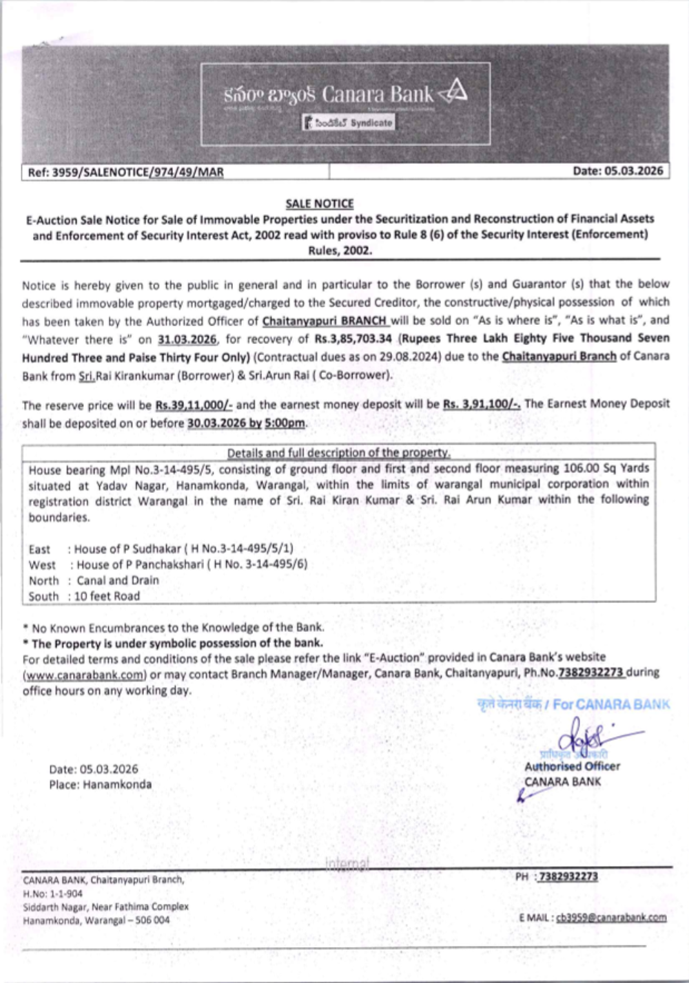 House bearing Mpl No.3-14-495/5, consisting of ground floor and first and second floor measuring 106.00 Sq Yards situated at Yadav Nagar, Hanamkonda, Warangal, within the limits of warangal municipal corporation within registration district Warangal in the name of Sri. Rai Kiran Kumar & Sri. Rai Arun Kumar within the following boundaries.