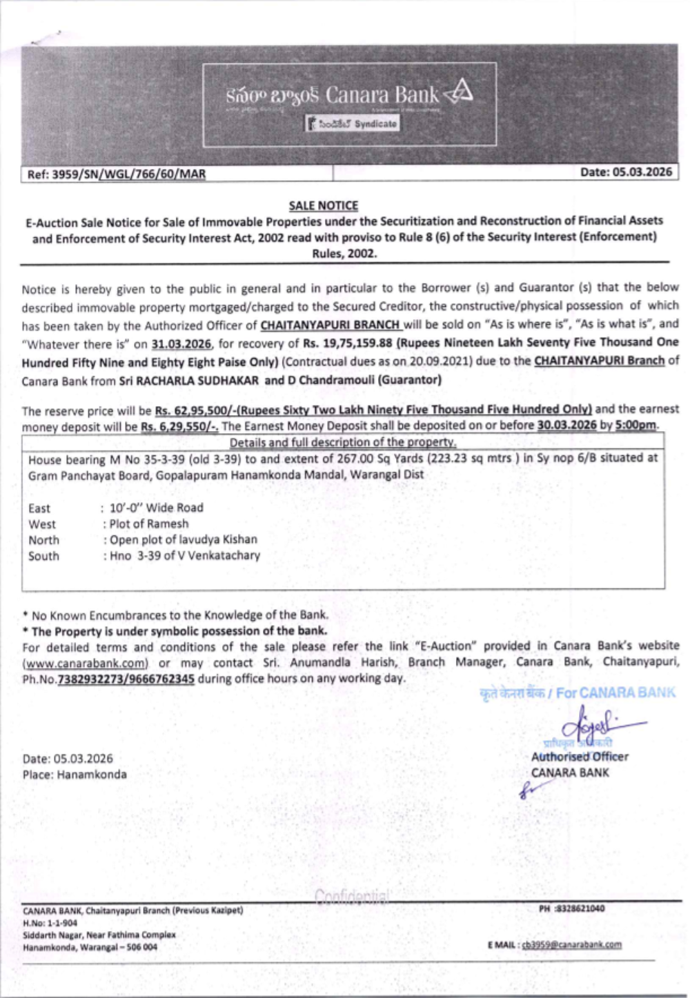 House bearing M No 35-3-39 (old 3-39) to and extent of 267.00 Sq Yards (223.23 sq mtrs ) in Sy nop 6/B situated at Gram Panchayat Board, Gopalapuram Hanamkonda Mandal, Warangal Dist
