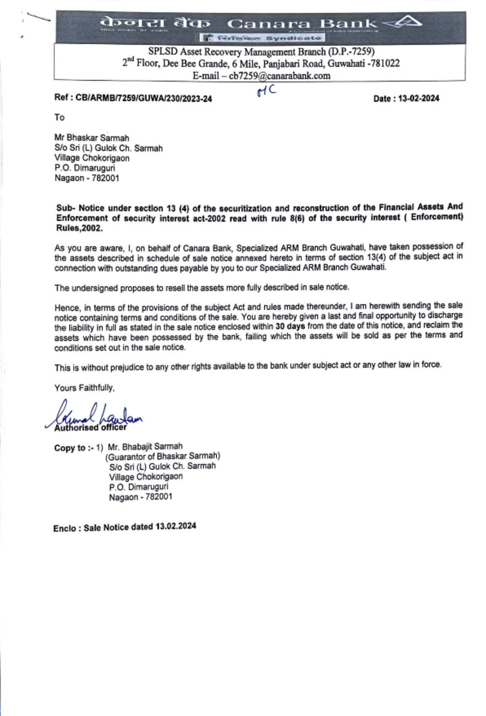 Property Details: Land measuring 9 Bigha 2 Katha 5 lecha under Patta No 300 & Dag No 219 located at village Misha Boraligaon, Roumari Dalani, District Nagaon, Assam in the name of Sri Bhaskar Sarmah