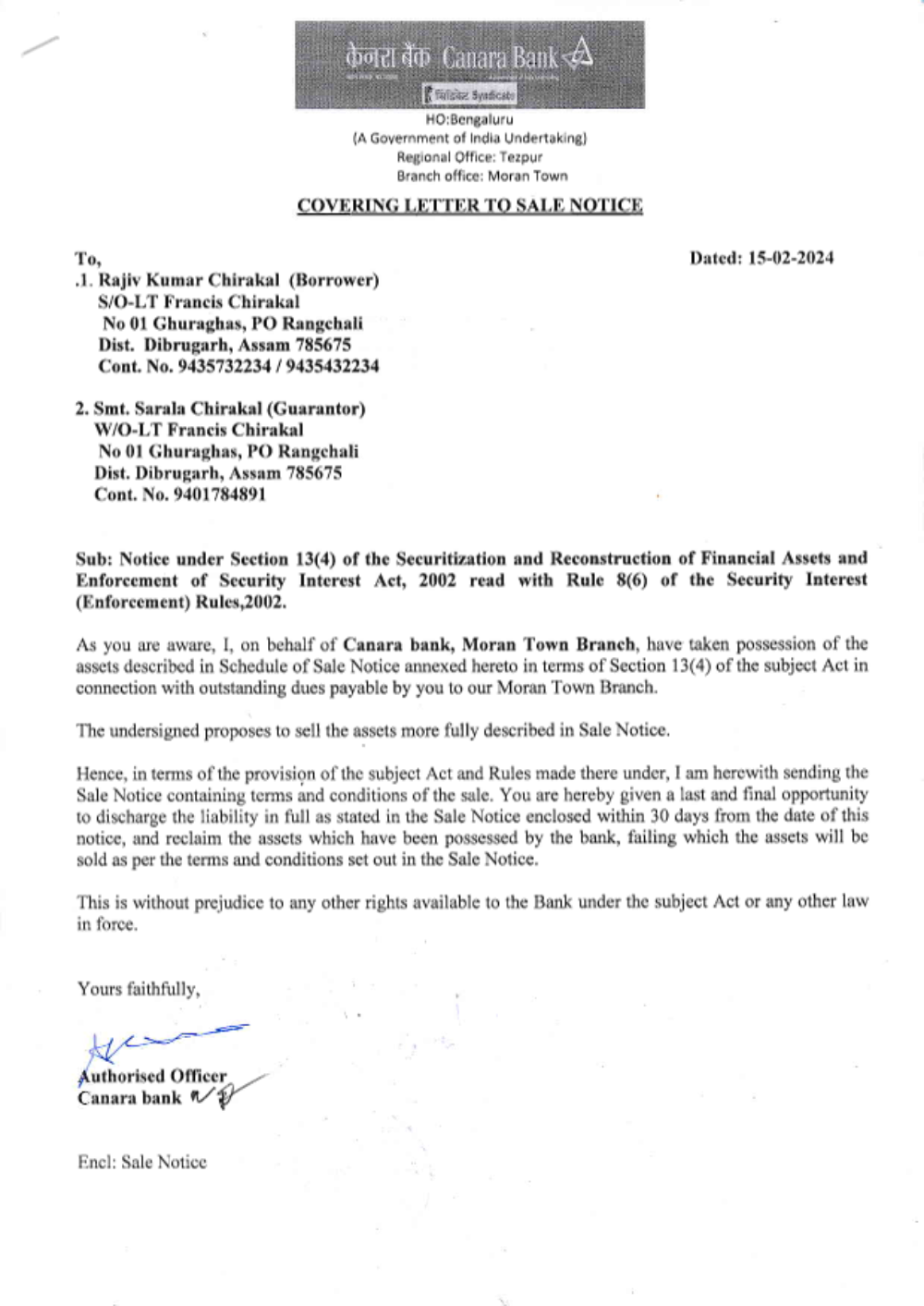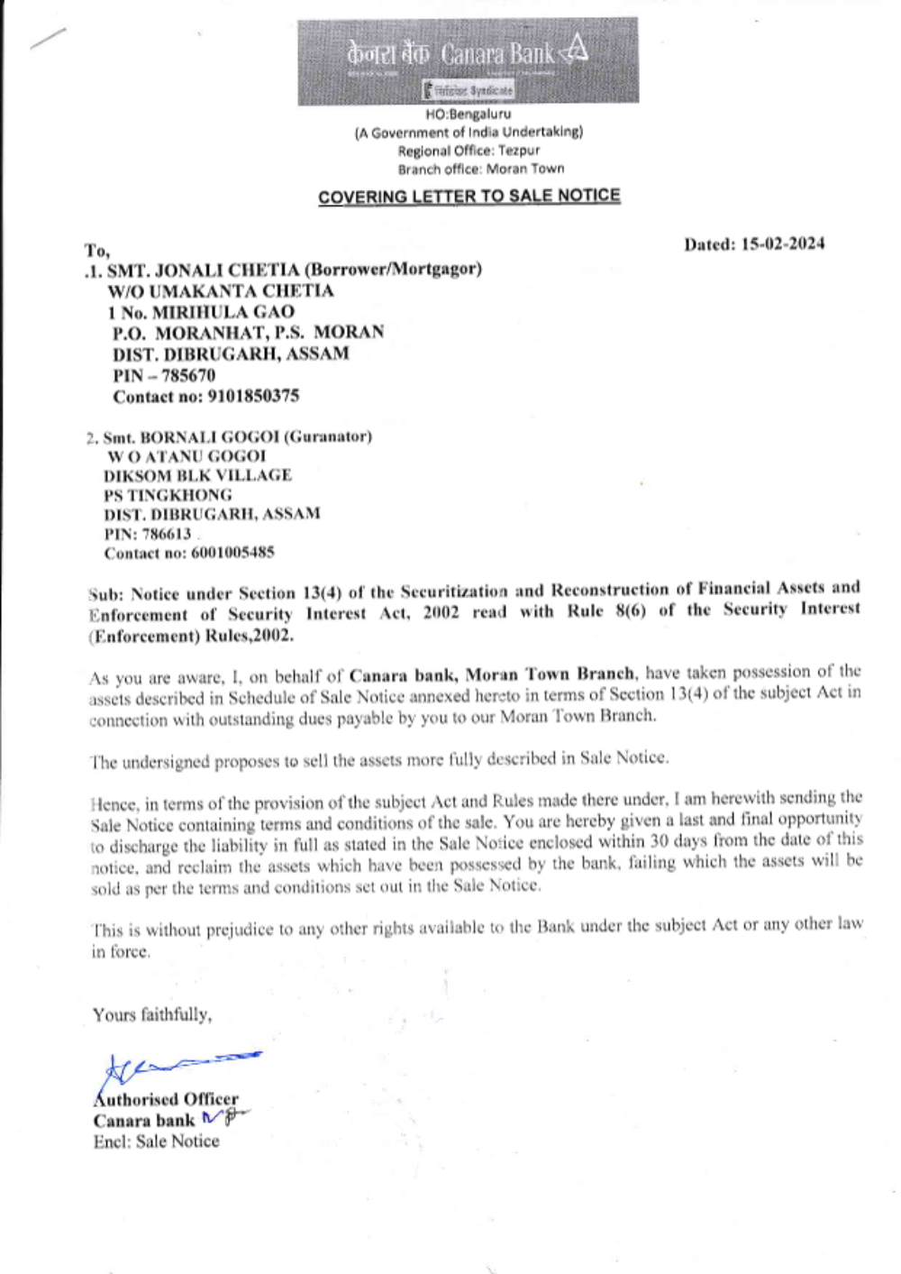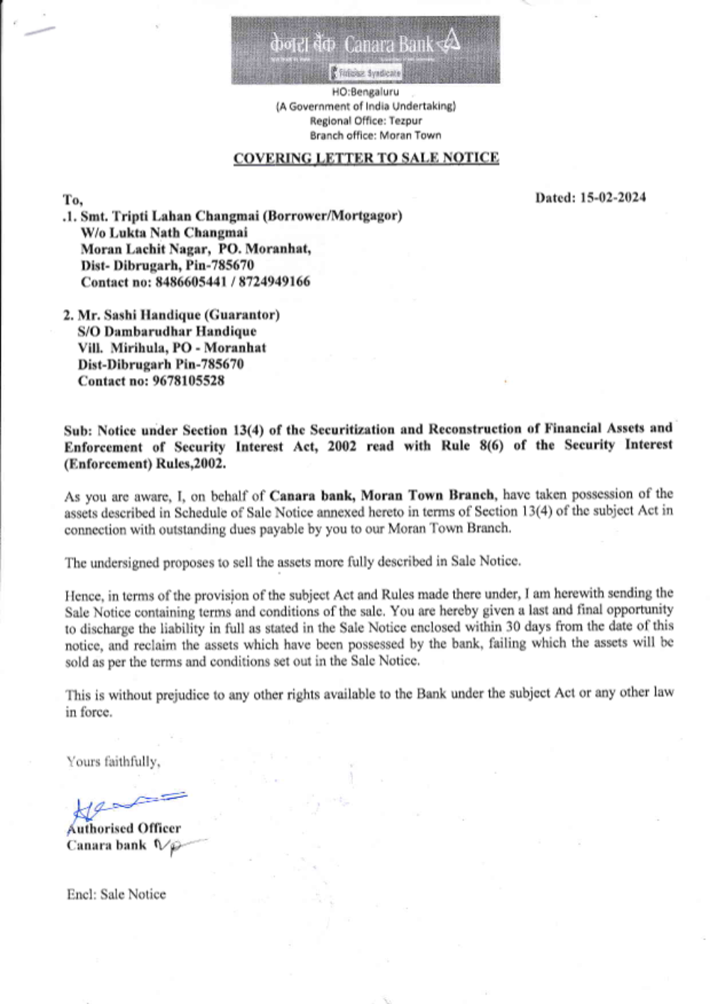 Property Details: All that part and parcel of Land and Building covered under PP No 50(New) / 6(old), Dag no 104(new)/20(old) of Hatkhola gaon, Mouza-Moran, PO/PS-Moran of Moran revenue circle, Dist-Dibrugarh, Assam,