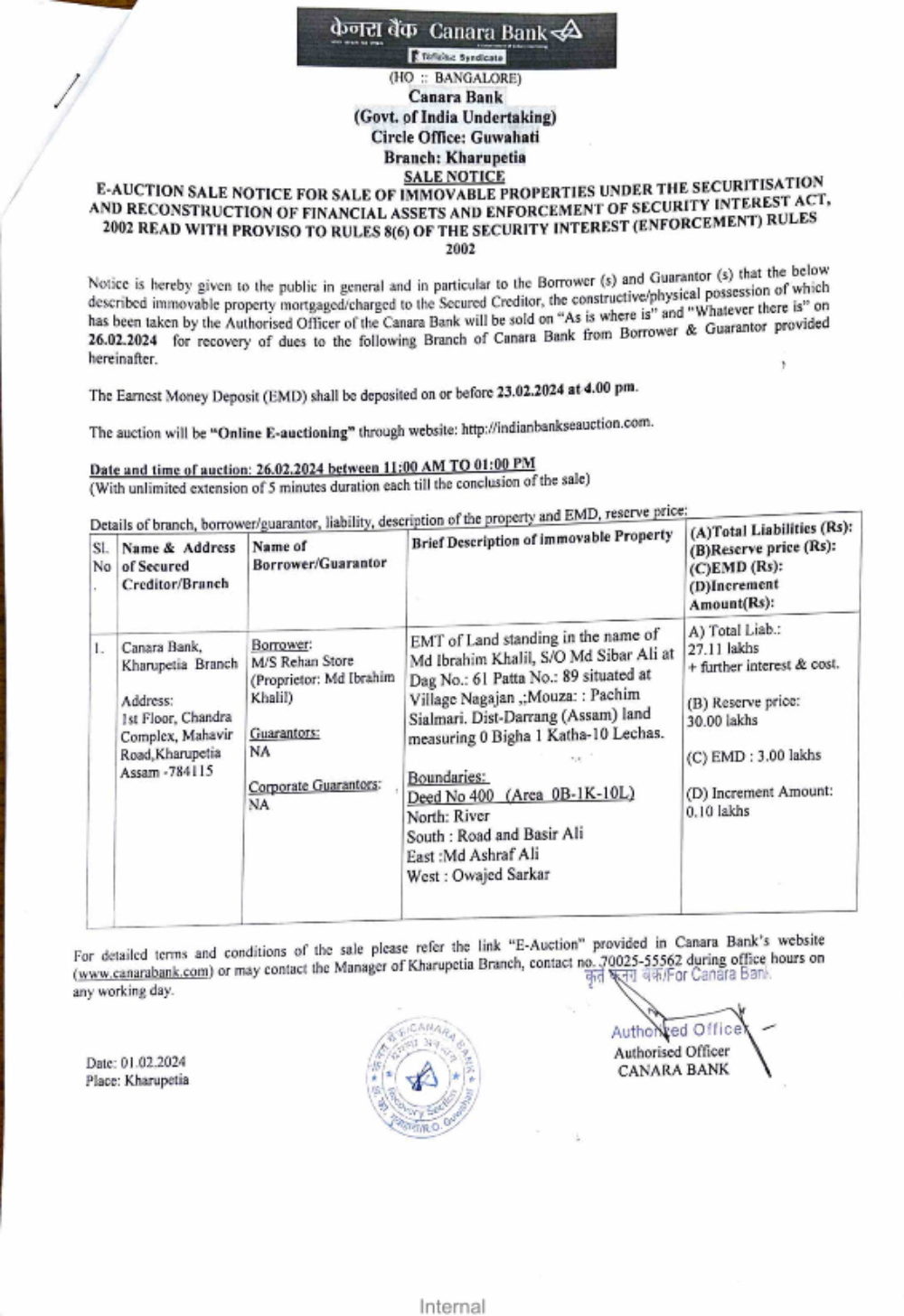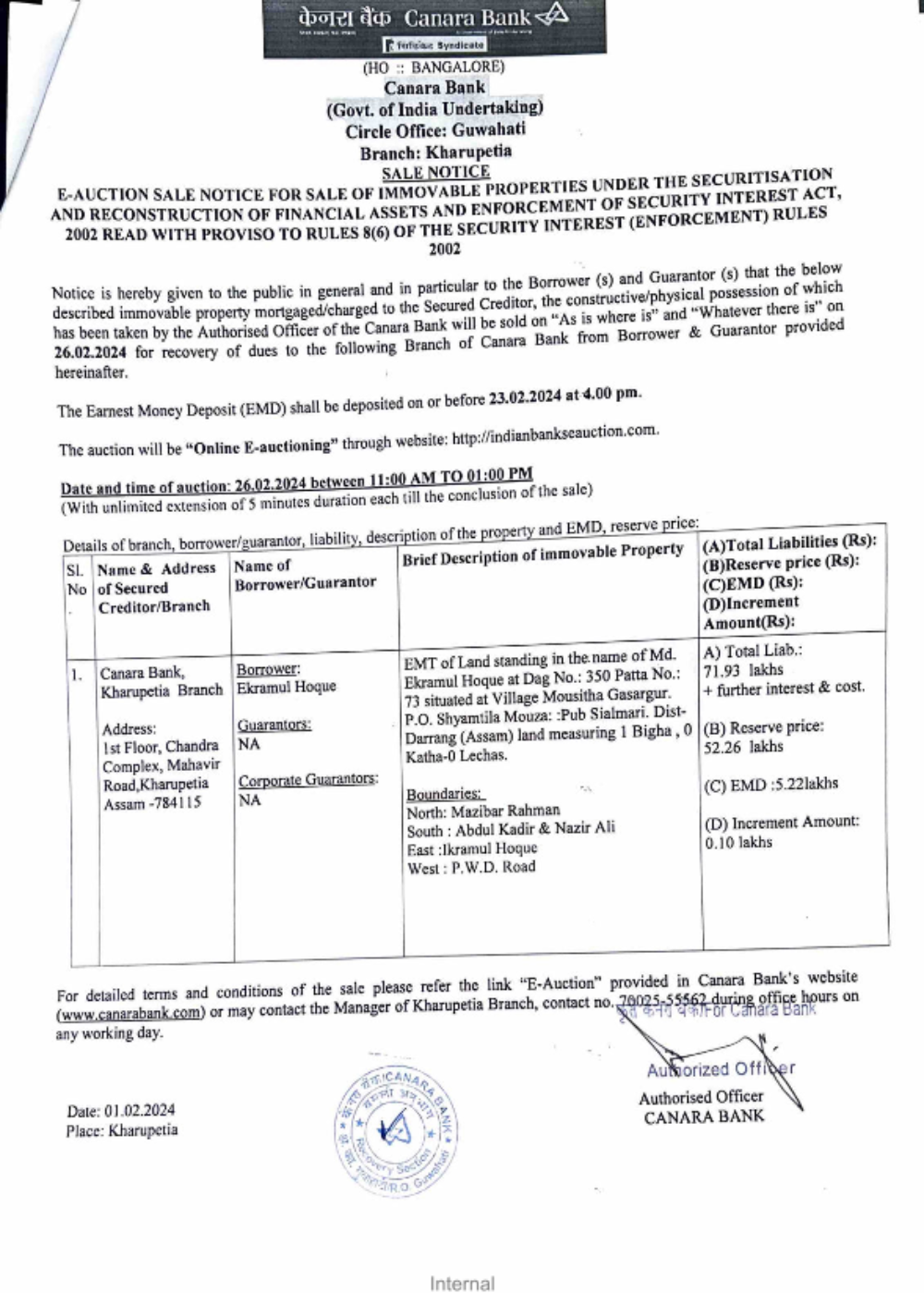 Property Details: All that part and parcel of land measuring 04 Bigha under Dag No. 112 and 04 Bigha under Dag No. 113, PP No.19, situated at Vill. Khowang T.E. 319 No. NLR Grant, mouza and police station: Khowang, under revenue circle –Moran, Dist – Dibrugarh, Assam