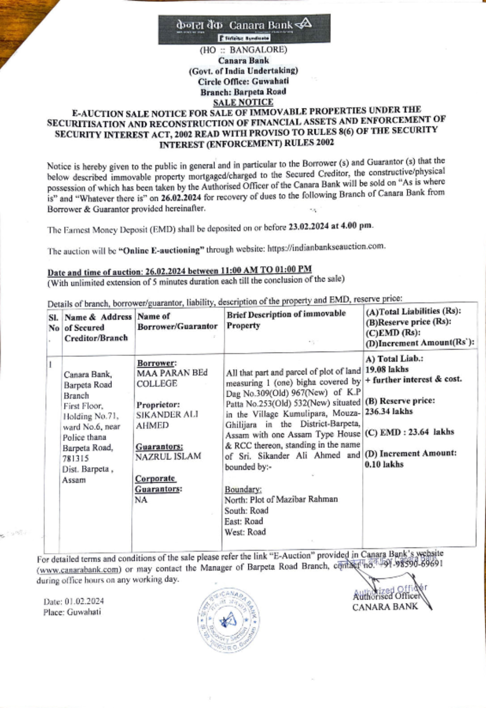 Property Details: All that part and parcel of plot of land measuring 1 (one) bigha covered by Dag No.309(Old) 967(New) of K.P Patta No.253(Old) 532(New) situated in the Village Kumulipara, Mouza-Ghilijara in the District-Barpeta, Assam with one Assam Type House thereon, standing in the name of Sri. Sikander Ali Ahmed and bounded by:-