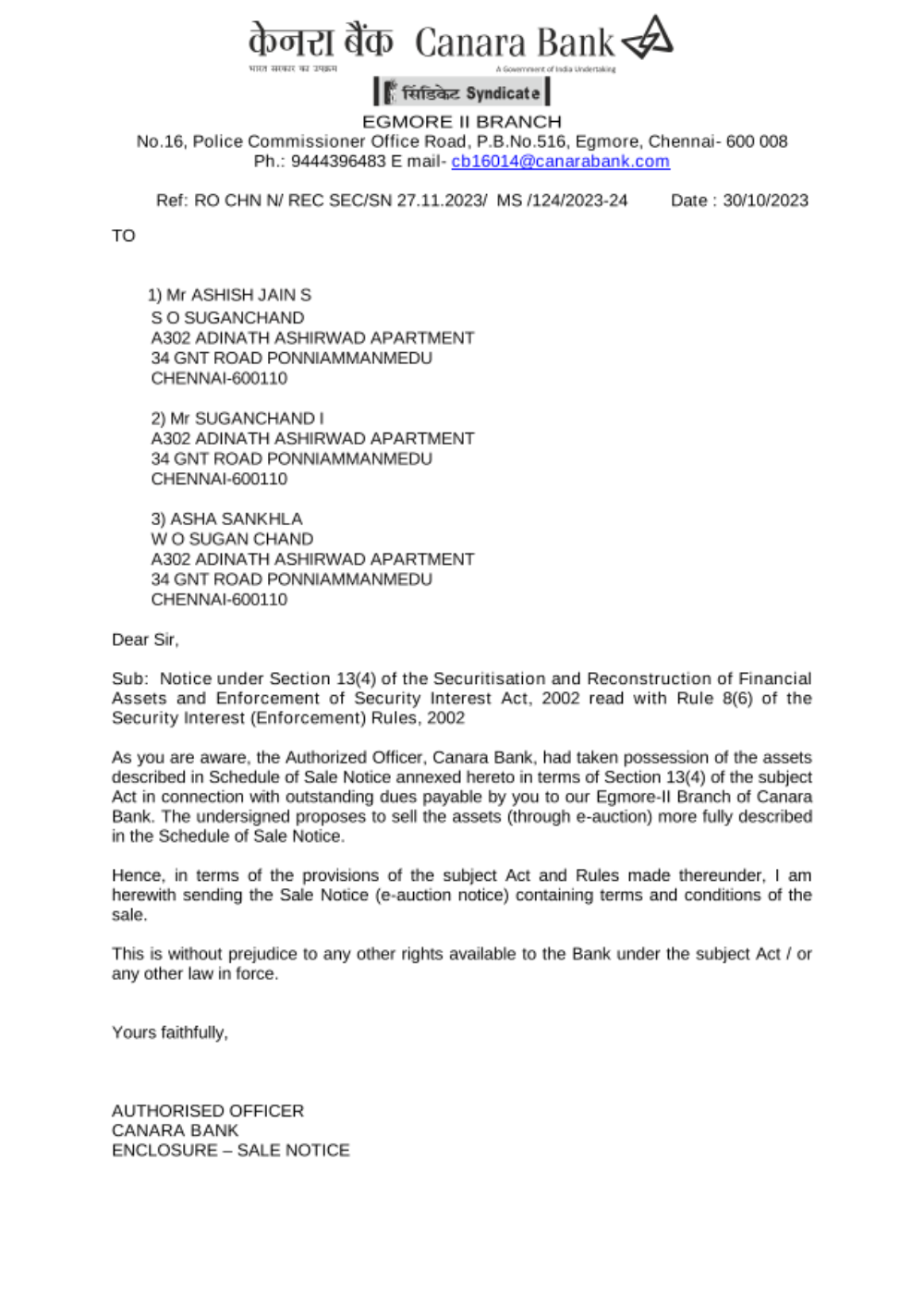Property Details: 435 Sqft undivided share in the land measuring about 78,768 sqft (7317.8 sq.mts) comprised in survey Nos. 1205/2 & 1206/1A2,New S No 33/2,situated at Madhavaram village,Madhavaram Taluk,Thiruvaluvar district together with proposed superstructure viz.,flat in the complex known as “ADINATH ASHIRWAD” Viz.,Apartment No.302 in “A” block in the third floor with a built up area of 1515 sq.ft situated within the sub registration district of Madhavaram and registration district of Chennai North owned by Ashish Jain & Asha Sankhla
