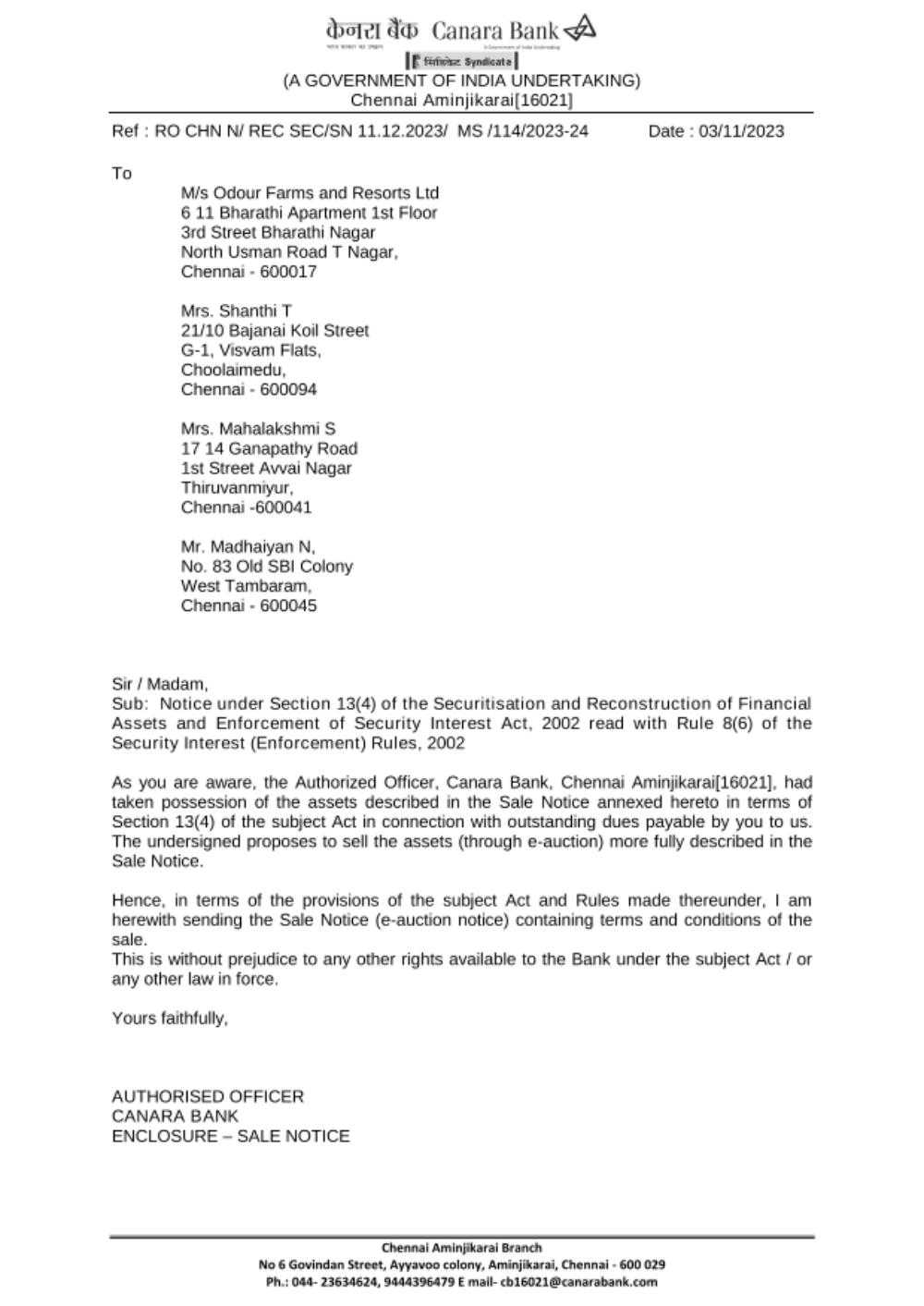 Property Details tem No.1: All that piece and parcel of land and building bearing Plot No 5 measuring an extent of 4823 Sq Ft comprised in Sy No 3/2A in NANDANVAN Garden Estates, situated at 109, Pattipulam Village, Chengalpet Taluk, Kancheepuram District situated within the Sub registration district of Thiruporur and in the Registration District of Chengalpet. owned by M/S Odour Farms and Resorts Limited and Bounded: