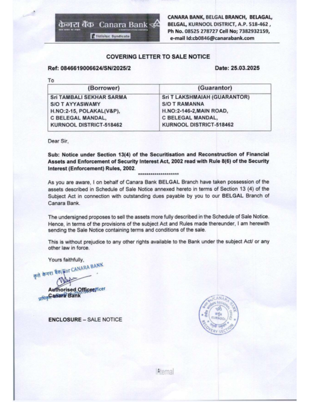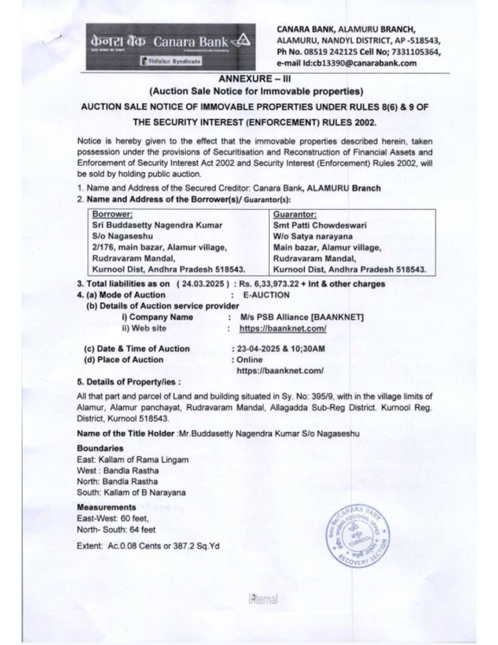 Property Details: All that part and parcel of Land and building situated in Sy. No: 395/9, with in the village limits of Alamur, Alamur panchayat, Rudravaram Mandal, Allagadda Sub-Reg District. Kurnool Reg. District, Kurnool 518543.