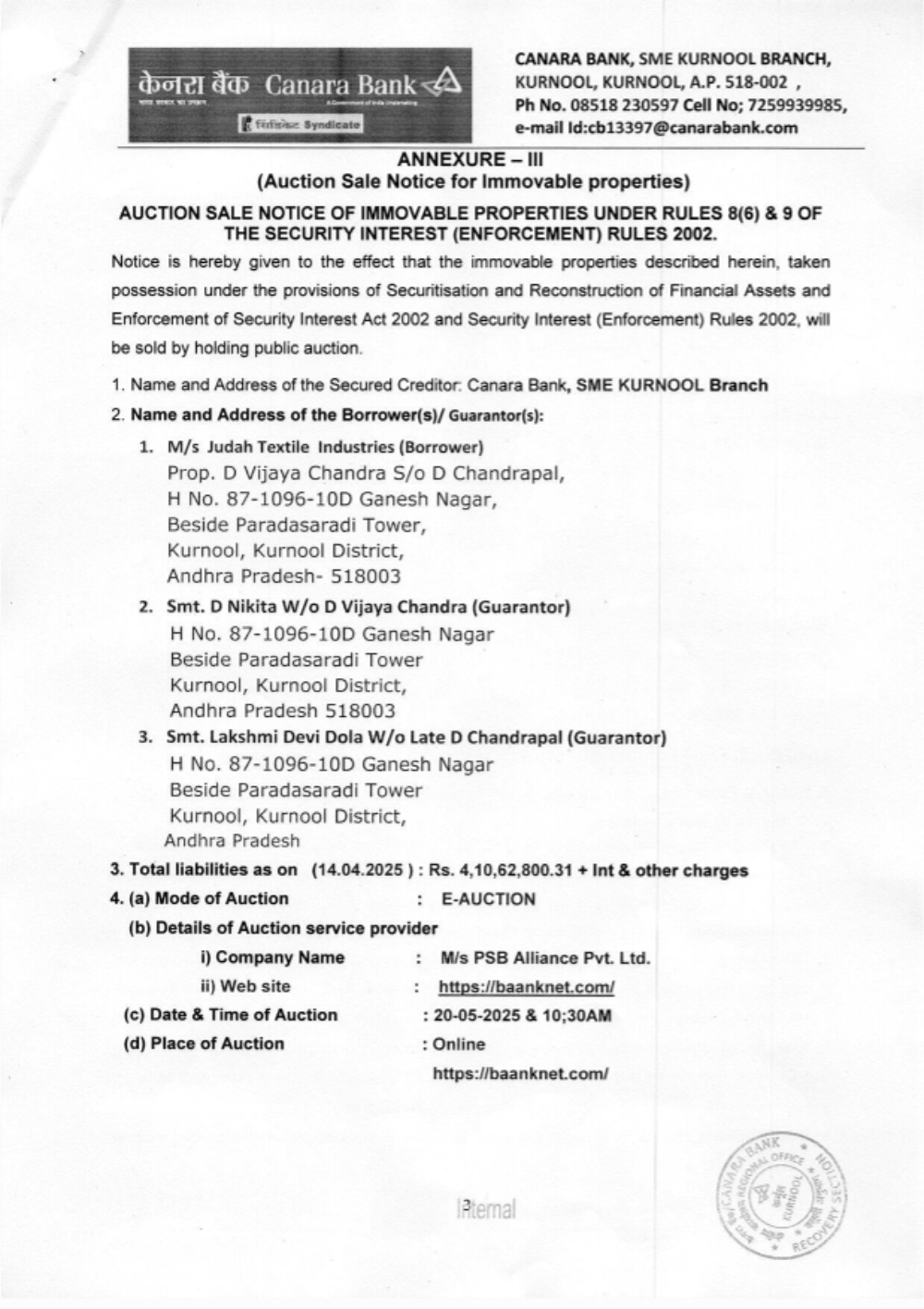 Date of E-Auction: 20-05-2025