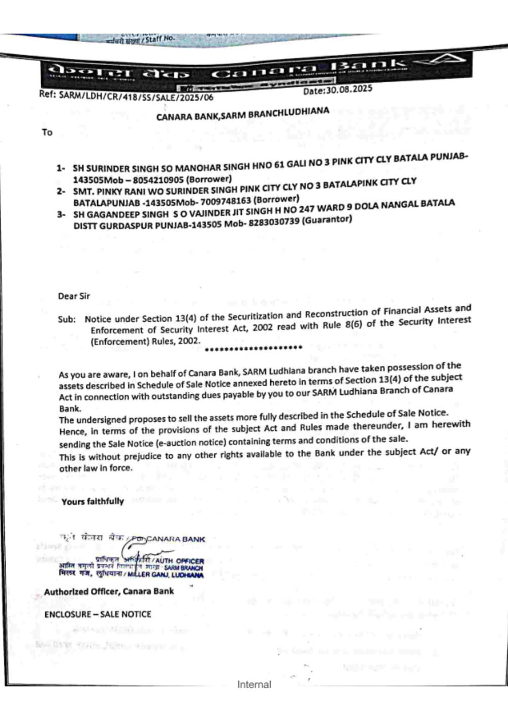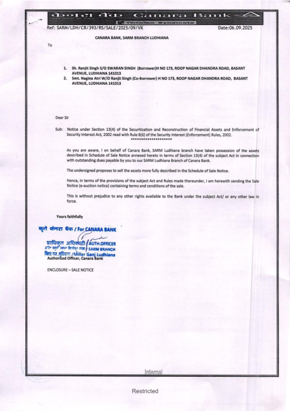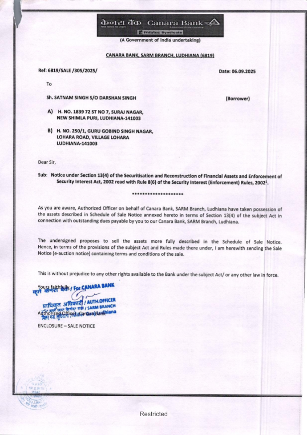 Name of Title holder: Sh. Satnam Singh Property Details: Property/House measuring 70 Sq. Yards, comprised in Khasra No. 171, 86, Khata No. 786/968, 787/969, as per Jamabandi for the year 2009-10, situated at village Lohara, (Abadi known as Guru Gobind Singh Nagar), Tehsil & Dist. Ludhiana.