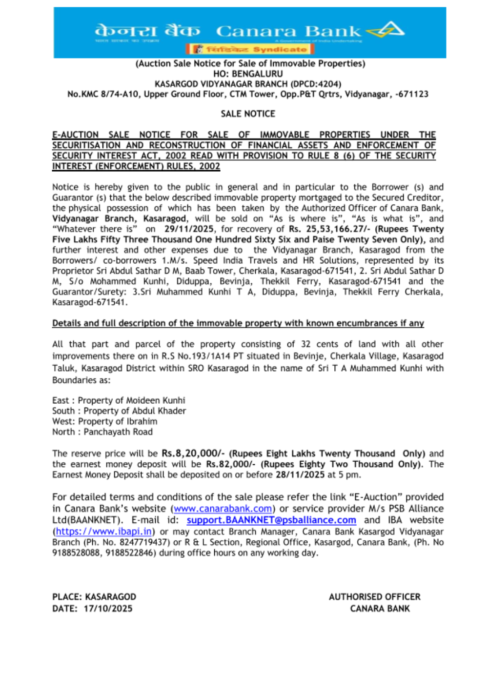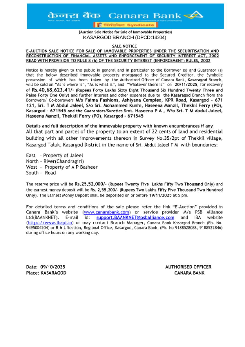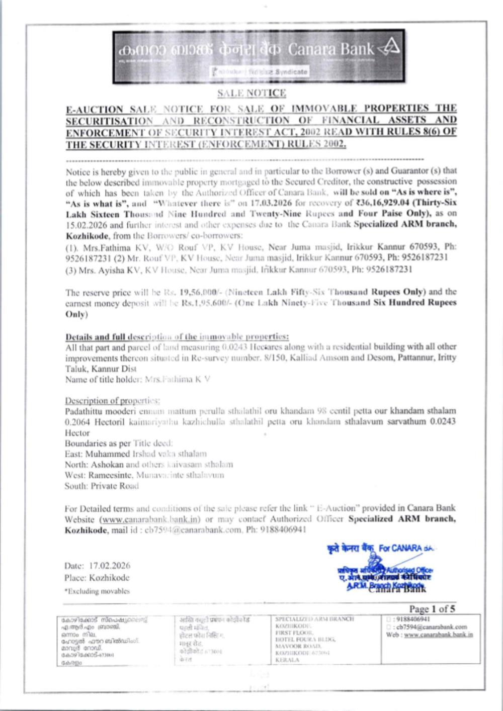 Property Type: Land and Building Name of Title holder: Mrs. Fathima K V Property Details: All that part and parcel of land measuring 0.0243 Hectares along with a residential building with all other improvements thereon situated in Re-survey No. 8/150, Kalliadi Amsom and Desom, Pannur, Iritty Taluk, Kannur District in the name of Mrs. Fathima K V. Description of Properties: Padathittu moderi ennum mattum perulla sthalathil oru khandam, 98 centil petta oru khandam sthalam, 0.2064 Hectore kaivasham kazhichulla sthalathil petta oru khandam sthalavum sarvathum 0.0243 Hector. Area: 0.0243 Hectares Bounded by: East : Muhammed Irshad vaka sthalam Reserve Price: Rs. 19,56,000/- Date of E-Auction: 17/03/2026 EMD amount: Rs. 1,95,600/- to be deposited on or before 16/03/2026 before 4.00 PM Property Inspection: With prior appointment with Authorized Officer on any working day between 10.00 AM and 5.00 PM Branch: Specialized Asset Recovery Management (ARM) Branch Kozhikode Branch Email ID : Cb7594@canarabank.com Branch Manager Contact No : 9188406941 RO Nodal Officer Contact No : 9188406941 E-Auction Website : http://baanknet.com