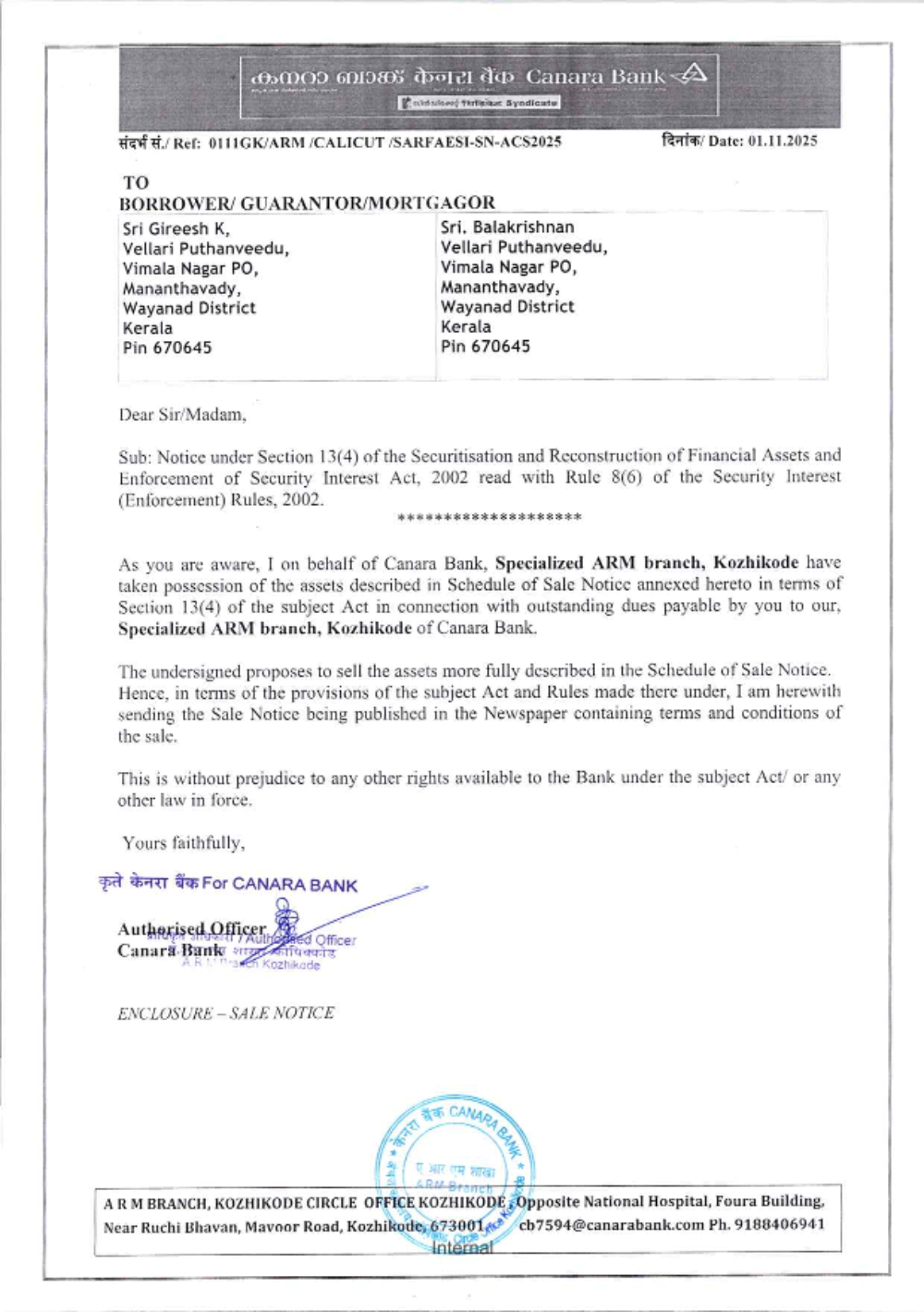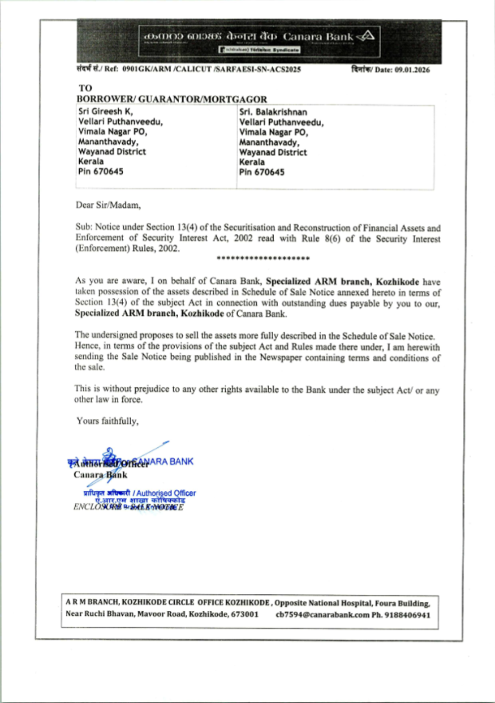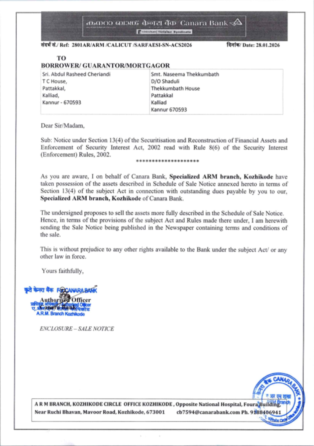 Property Type: Land and Building Name of Title holder: Mrs. Fathima K V Property Details: All that part and parcel of land measuring 0.0243 Hectares along with a residential building with all other improvements thereon situated in Re-survey No. 8/150, Kalliadi Amsom and Desom, Pannur, Iritty Taluk, Kannur District in the name of Mrs. Fathima K V. Description of Properties: Padathittu moderi ennum mattum perulla sthalathil oru khandam, 98 centil petta oru khandam sthalam, 0.2064 Hectore kaivasham kazhichulla sthalathil petta oru khandam sthalavum sarvathum 0.0243 Hector. Area: 0.0243 Hectares Bounded by: East : Muhammed Irshad vaka sthalam Reserve Price: Rs. 19,56,000/- Date of E-Auction: 17/03/2026 EMD amount: Rs. 1,95,600/- to be deposited on or before 16/03/2026 before 4.00 PM Property Inspection: With prior appointment with Authorized Officer on any working day between 10.00 AM and 5.00 PM Branch: Specialized Asset Recovery Management (ARM) Branch Kozhikode Branch Email ID : Cb7594@canarabank.com Branch Manager Contact No : 9188406941 RO Nodal Officer Contact No : 9188406941 E-Auction Website : http://baanknet.com