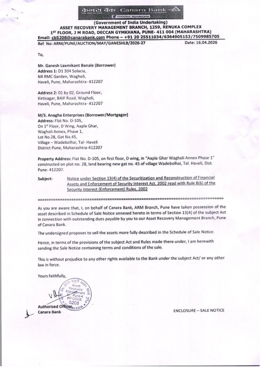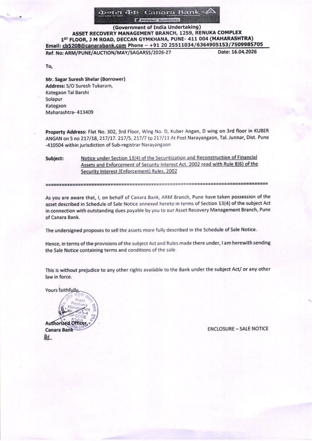 Co-ordinates: 18°29'03.5"N 73°57'05.5"E Reserve Price: Rs. 22,00,000.00 Date of E-Auction: 21.04.2026 EMD amount: Rs. 2,20,000.00 to be deposited on or before 21.04.2026 BAANKNET Property ID: CNRB25613599A Branch Email ID : cb5208@canarabank.com Branch Manager Contact No : 8739018778 RO Nodal Officer Contact No : 7020010307 E-Auction Website : https://BAANKNET.COM/
