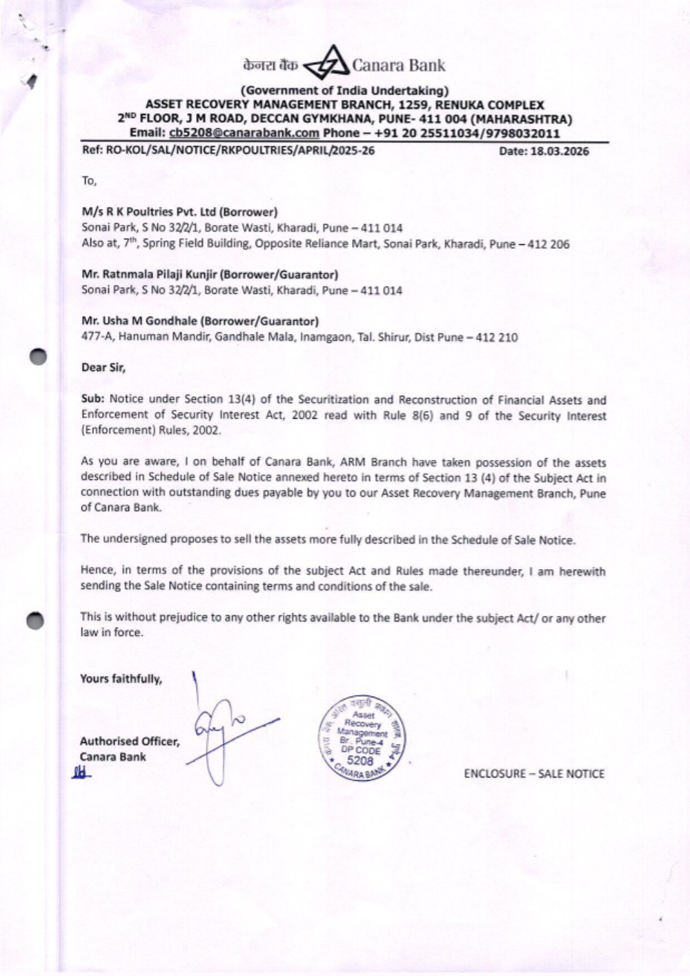 Co-ordinates: 18°30'58.3"N 73°56'56.1"E Reserve Price: Rs. 2,30,00,000.00 Date of E-Auction: 21.04.2026 EMD amount: Rs. 23,00,000.00 to be deposited on or before 21.04.2026 BAANKNET Property ID: CNRB25613599 Branch Email ID : cb5208@canarabank.com Branch Manager Contact No : 8739018778 RO Nodal Officer Contact No : 7020010307 E-Auction Website : https://BAANKNET.COM/