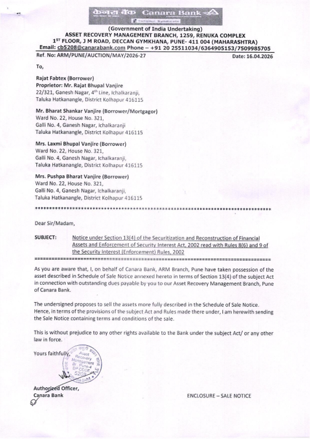 Property Type: Residential Property Name of Title holder: Rajat Fabtex Proprietor: Mr. Rajat Bhupal Vanjire Details and full description of the property: All that part and parcel of C.S. No. 21765, Gat No.744(Part), Plot No.02(Part) Malmatta No. 222000495 & 222000496, Ward No. 22, Ganeshnagar 04th Lane, Near Fie Research Institute, Shahpur-Ichalkaranji, Taluka Hatkanangle, District Kolhapur- 416115.