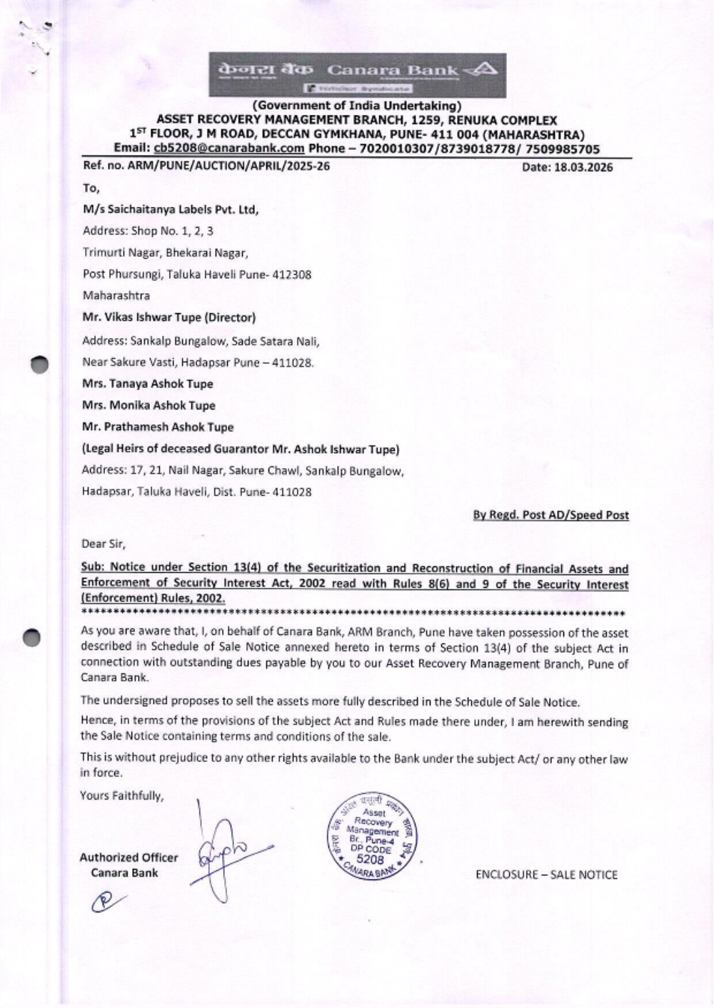 Property Type: Residential Property Name of Title holder: M/s Saichaitanya Labels Pvt. Ltd Details and full description of the property: All that piece and parcel of residential Bungalow (Sankalp Bungalow) and open NA Plot at Survey No 138+139+173+177+181+182+184+185+187 to 201 & 242 to 244, 197/7A/1 (old), situated at village Sadestranali, Hadapsar, within Pune Corporation limit in the name of Mr. Vikash Ishwar Tupe.