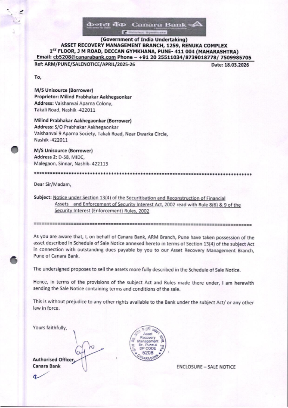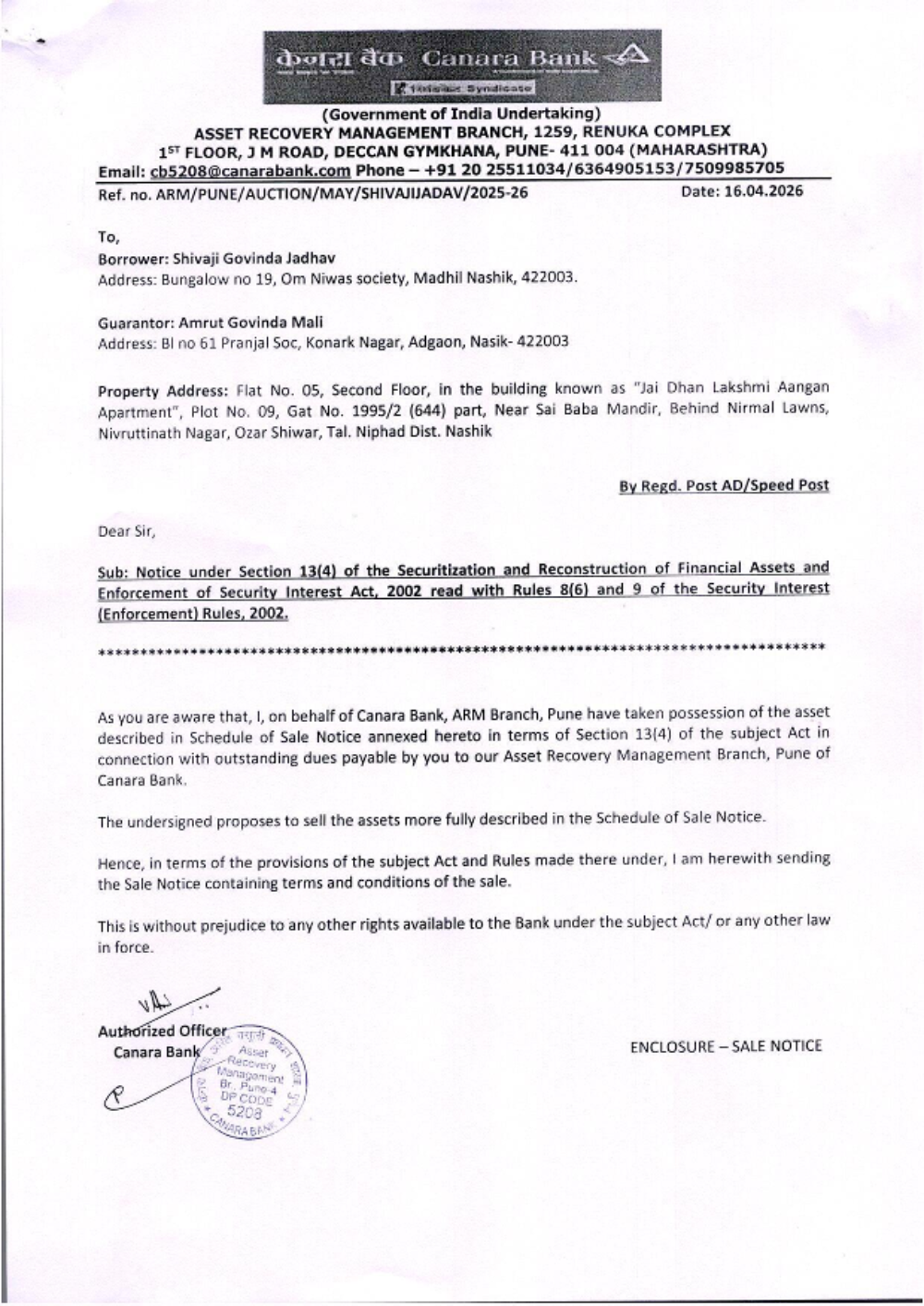 Co-Ordinates: Latitude: 20°05'03.8"N Longitude: 73°55'24.4"E Reserve Price: Rs. 29,50,000.00 Date of E-Auction: 12.05.2026 EMD amount: Rs. 2,95,000.00 to be deposited on or before 12.05.2026 BAANKNET property ID: CNRB112046494 Branch Email ID : cb5208@canarabank.com Branch Manager Contact No : 8739018778 RO Nodal Officer Contact No : 7020010307E E-Auction Website : https://BAANKNET.COM/