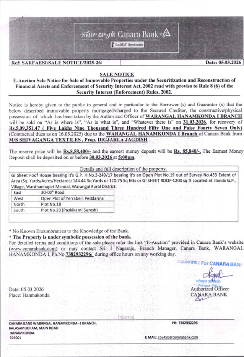 GI Sheet Roof House bearing it's G.P. H.No.3-249/17 bearing it's an Open Plot No.19 out of Survey No.433 Extent of Area (Sq. Yards/Acres/Hectares) 144.44 Sq Yards or 120.75 Sq Mts or GI SHEET ROOF-1200 sq ft Located at Illanda G.P., Village, Wardhannapet Mandal, Warangal Rural District: