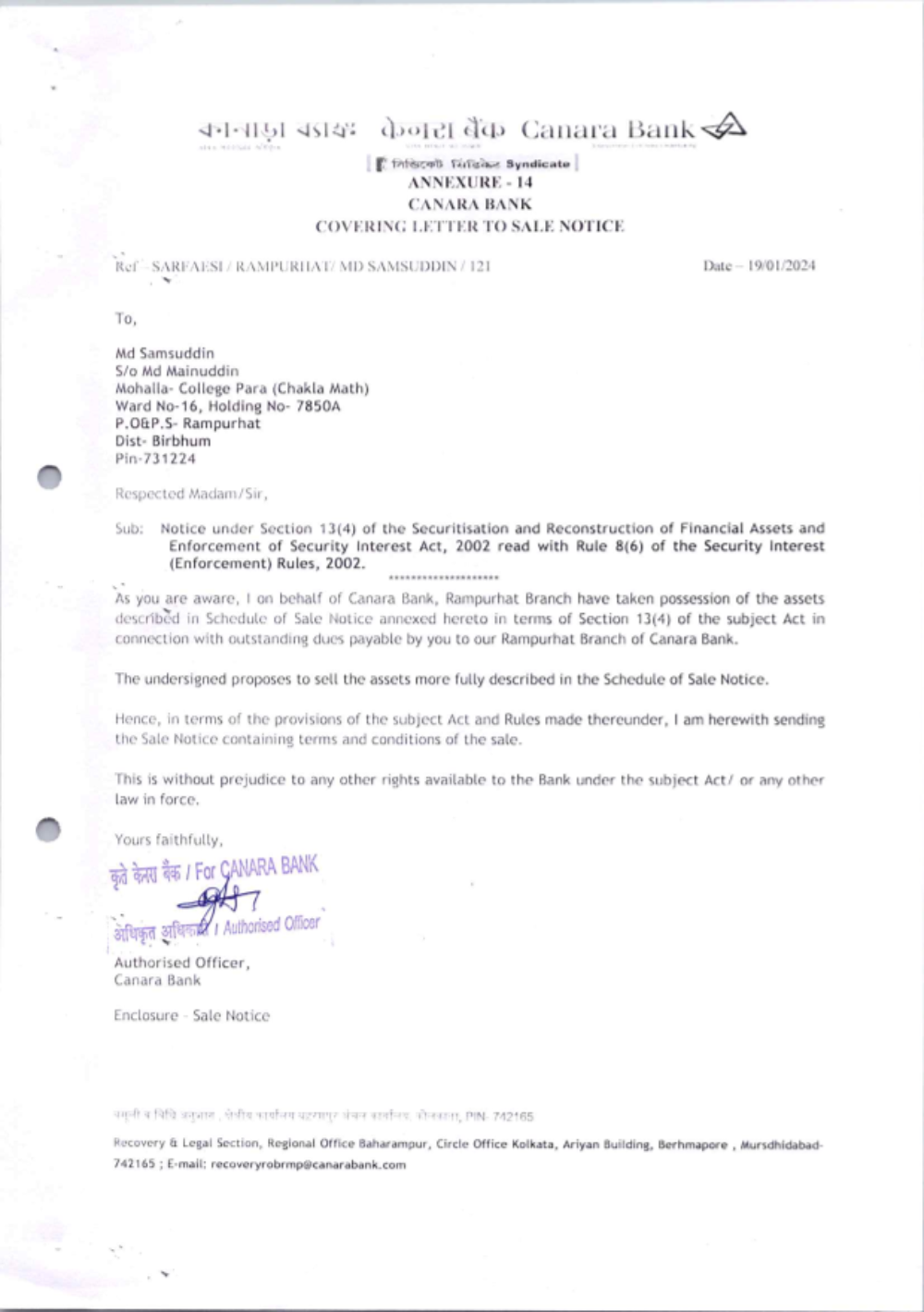 All that part and parcel of the property of land and residential building situated at Mouza- Rampurhat, J. L No- 77, R.S Khatian No- 517, L R Khatian No- 11066, Plot No- 1800/2368 (RS) 3225 (Hal), Area 03 Dec, Mohalla- College Para (Chakla Math), Ward-No-16, Holding No- 7850A, PO & PS- Rampurhat, Dist- Birbhum,Pin-731224 in the name of Md Samsuddin.
