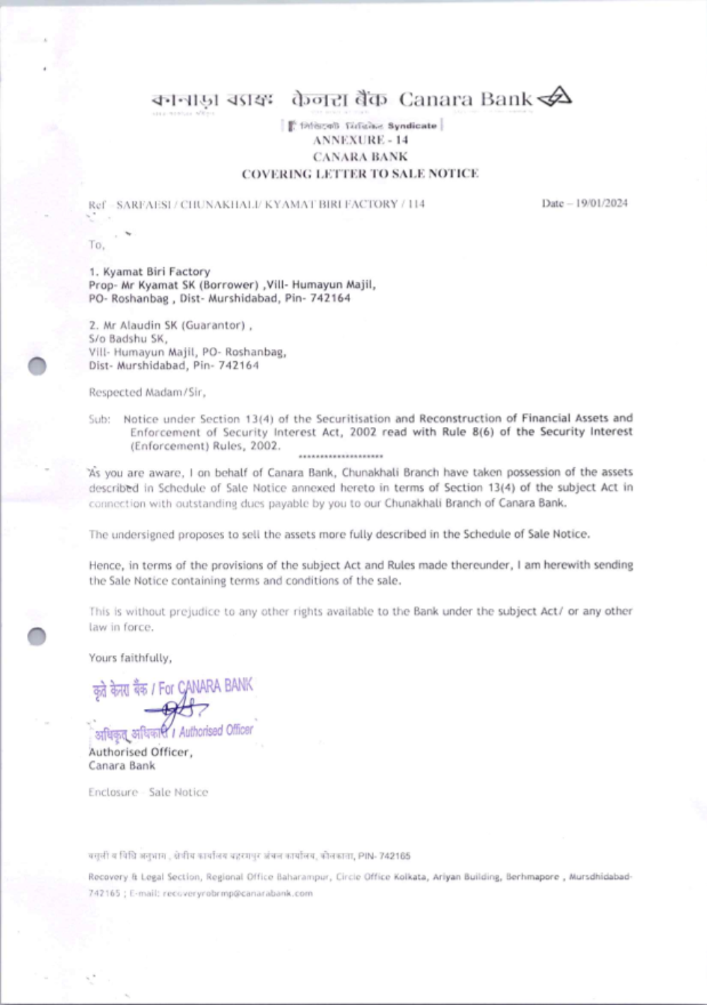 All that Part and parcel of the property (Land and Building) measuring an area of 13 decimal situated at Vill- Humayun Manjil . PO- Roshanbag, PS & Dist- Murshidabad under Prosadpur Gram Panchayat , Kh No- LR-411,RS 127, Plot No- RS- 10, LR 17, JL 20 under Mouza Gobindapur Lakheraj