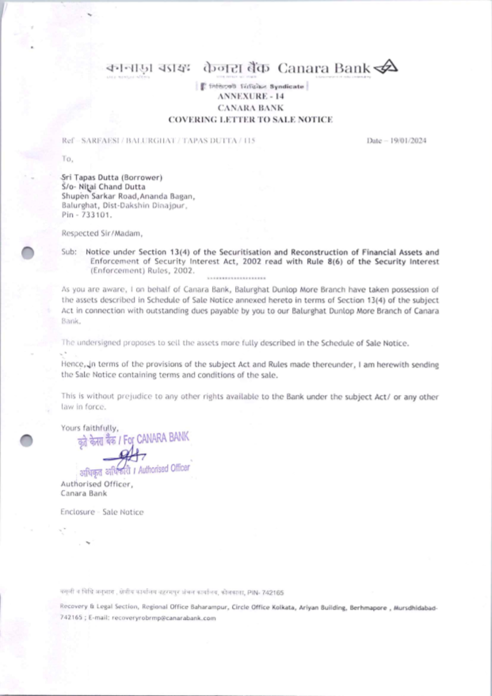 All that part and parcel of the property of land and residential structure located at Mouza- Khadimpur, JL No : 110, Plot No : RS – 476 and L R – 1350, Khatian No : RS 231(old), LR 1076(new) under PO +PS – Balurghat, Area- 4.16 decimal, in the name of Smt. Jyotshna Rani Dutta (Guarantor).