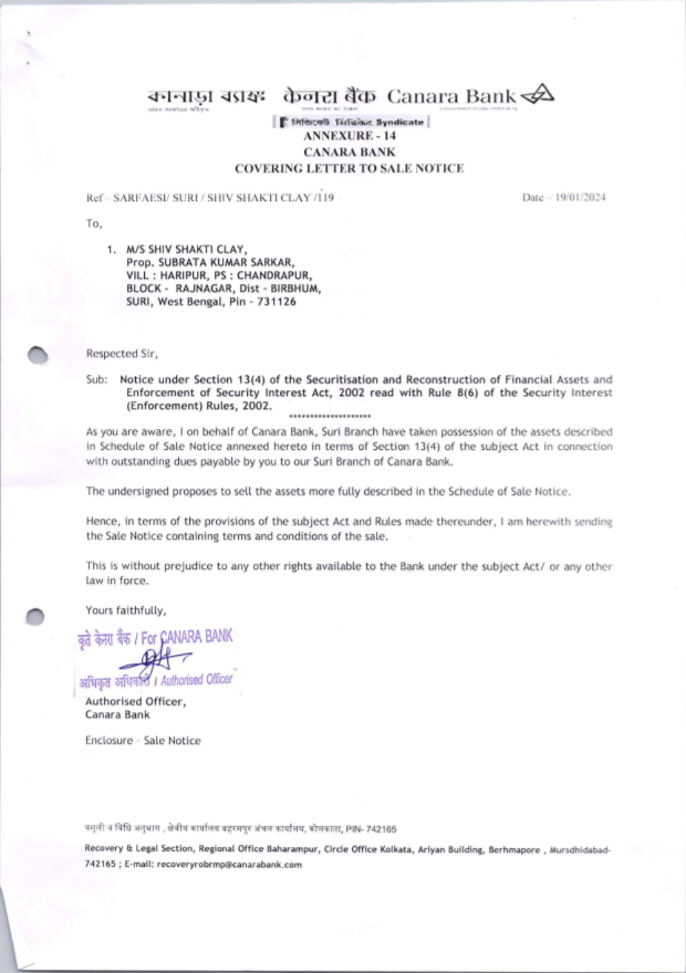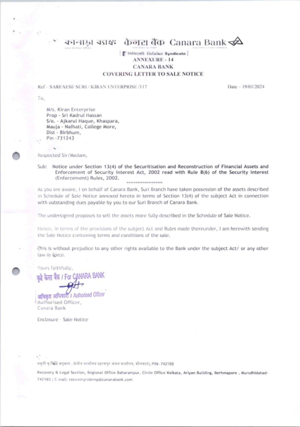 All that part and parcel of the property of land and single storied building at mouza – Durgapur, JL No :079, LR Plot No : 363, 535, LR Khatian No : 100, P.O – Ganeshpur, P.S – Chandrapur, Suri, Dist – Birbhum, Pin – 731126 under Chandrapur Gram Panchayat. Area 1.48 acre.