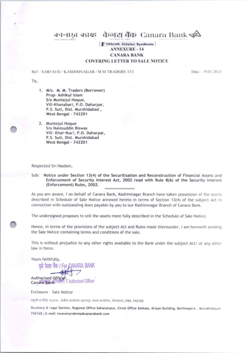 All that piece and parcel of the property of land & building situated at Mouza Ichhlipara, J.L. No. 59, L.R. Khatian No. 1446, 1447 & L.R. 8958/1, Plot. No. R.S. 1628 & L.R. 2220, Vill Khanabari, under Aurangabad Gram Panchayat, P.O. Daharpar, P.S. Suti, Dist. Murshidabad of land measuring 06 decimal in the name of Muntejul Haque.
