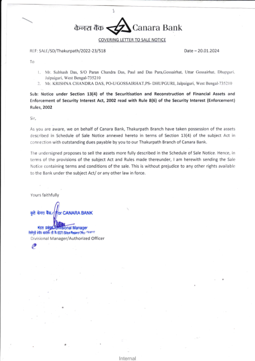 Property Details: Land owned by Sri Subhas Das s/o Paran Chandra Das vide Gift Deed no I -00787 dated 04.04.2012 measuring 0.05 acres of land (be the same or little more or less) along with one storied building thereon covered by Dag No. 25 (LR) corresponding to 14(RS), Khatian No. 10(RS) Touzi No 85, JL No 094(LR) and 174(RS) under mouza – Uttar Gossairhat, PS – Dhupguri, situated at Daspara, Vill – Uttar Gossairhat, Dist – Jalpaiguri, WB – 735210