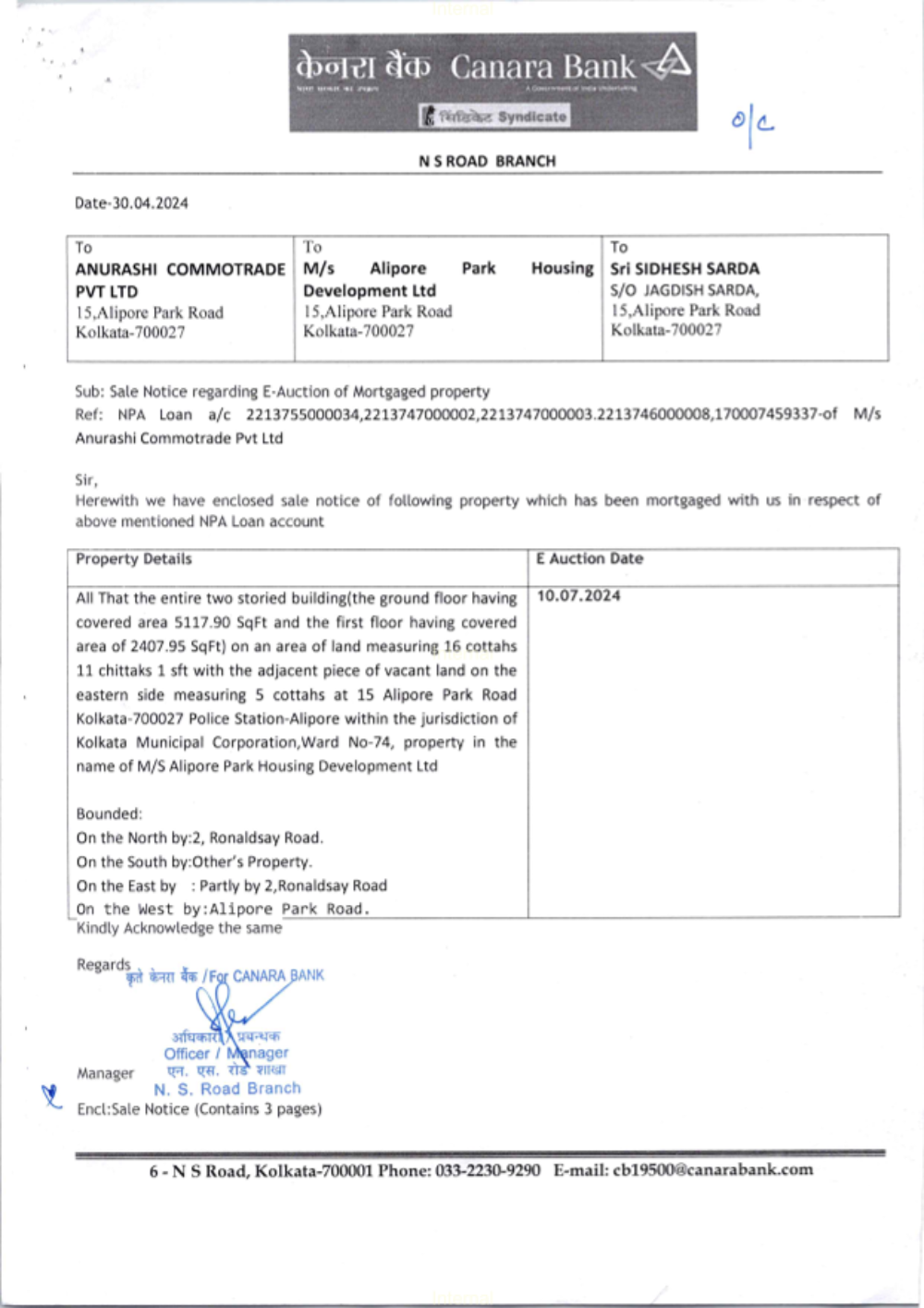 Property Details: All That the entire two storied building (the ground floor having covered area 5117.90 SqFt and the first floor having covered area of 2407.95 SqFt) on an area of land measuring 16 cottahs 11 chittaks 1 sft with the adjacent piece of vacant land on the eastern side measuring 5 Cottahs at 15 Alipore Park Road Kolkat-700027 Police station-Alipore within the jurisdiction of Kolkata Municipal Corporation, Ward No-74, Property in the name of M/S Alipore park Housing Development Ltd: -